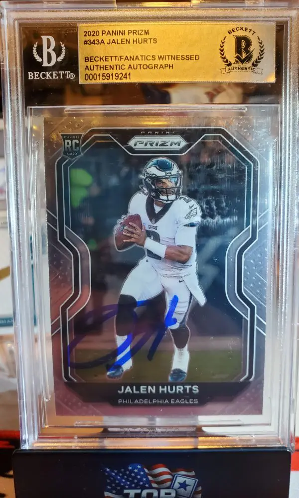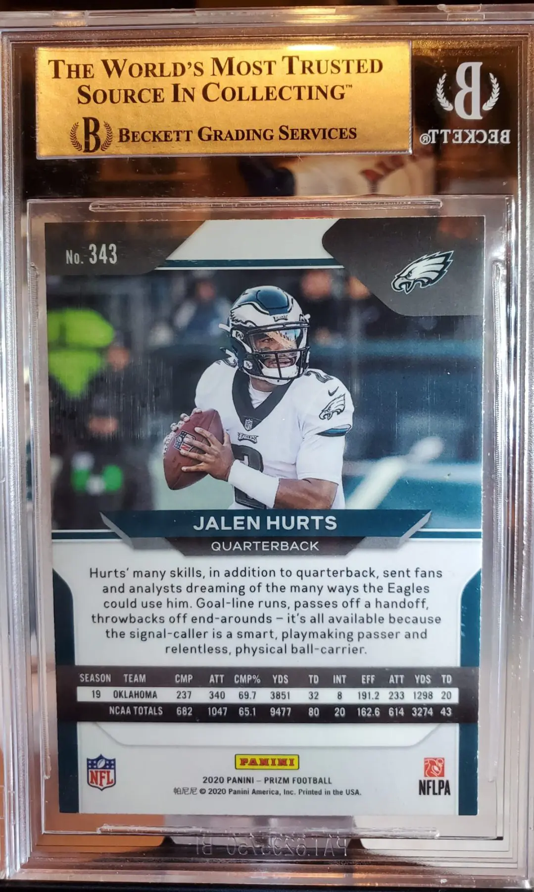 The 2020 PRIZM #343 JALEN HURTS ROOKIE AUTO trading card is a highly sought-after collectible item for fans of the Philadelphia Eagles and NFL. This hard-signed autograph card features Jalen Hurts, the standout rookie quarterback, in his debut season. Manufactured by Panini as part of the 2020 Panini Prizm set, this original card is made of card stock with a thickness of 35 Pt. The card is authenticated by Beckett Authentication Services (BAS) and comes with a unique autograph authentication number, making it a valuable addition to any sports trading card collection.