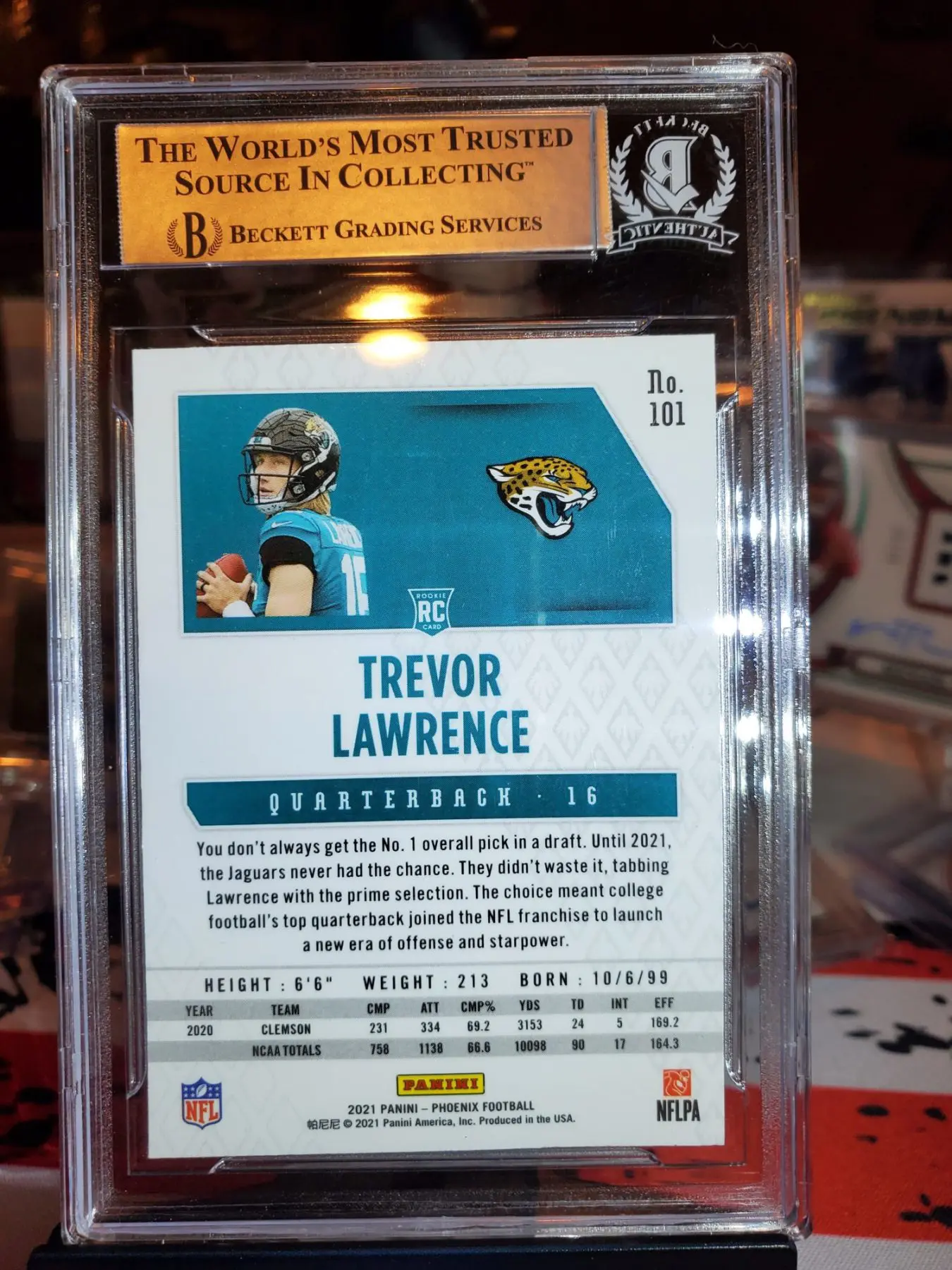 The 2021 Panini Phoenix Rookie Trevor Lawrence #101 Fire Burst Auto trading card is a highly sought-after collectible featuring the autograph of Trevor Lawrence, a promising young football athlete. This original card, authenticated by Beckett Authentication Services, is part of the Fire Burst parallel variety set and is made of sturdy 20 Pt. card stock. As a hard-signed autograph with a unique authentication number, this card is a valuable addition to any sports trading card collection, particularly for fans of the Jacksonville Jaguars and the National Football League.