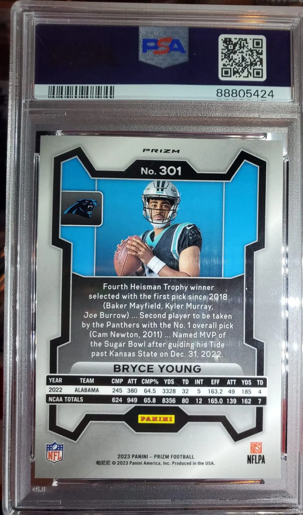 The 2023 Panini Prizm – Rookie Variation Bryce Young #301 Silver Prizm (RC) is a highly sought-after sports trading card featuring the talented football player Bryce Young. This original card is part of the 2023 Panini Prizm set, manufactured by Panini in the United States. With a sleek silver prizm parallel variety, this card is made of durable card stock and is a valuable addition to any collection. Perfect for fans of the National Football League and collectors of trading cards, this rookie variation is a standout piece for enthusiasts of football memorabilia.