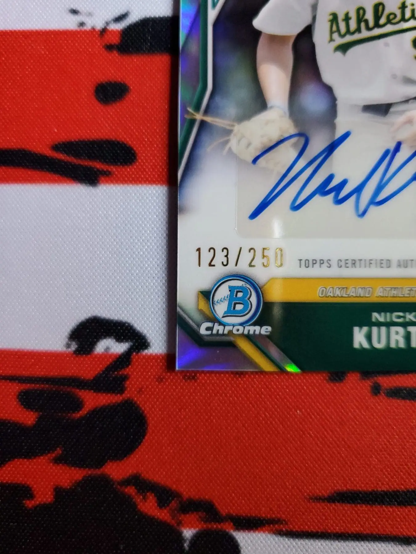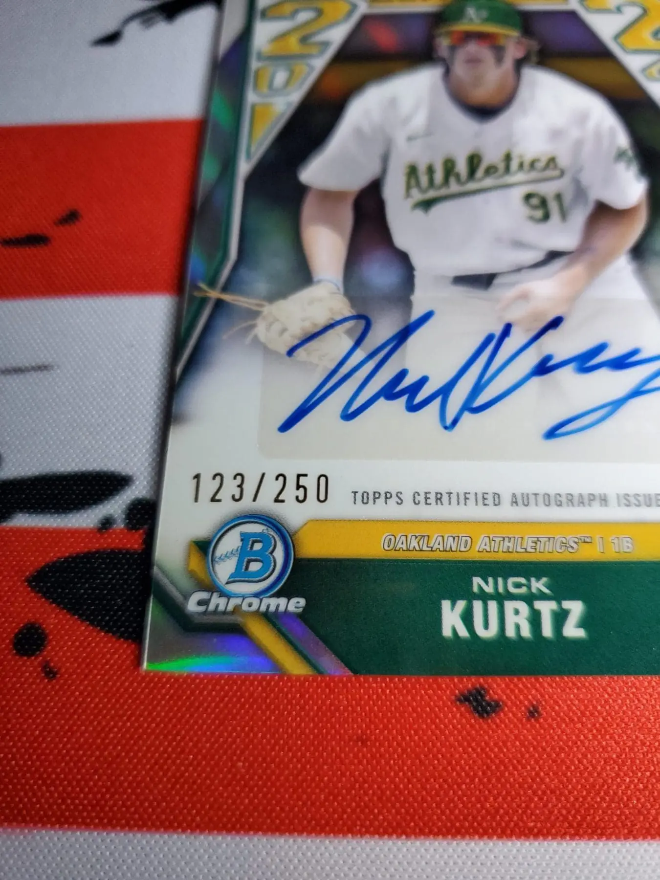 The 2024 Bowman Draft Class of 2024 Autographs Nick Kurtz trading card features a standard size and is autographed by Nick Kurtz, who is a player for the Oakland Athletics in Major League Baseball. This rookie card is serial numbered out of 250 and authenticated by Topps, making it a valuable addition to any baseball card collection. The card is made of 35 Pt. card stock material and showcases a label or sticker autograph format in English language. Part of the Class of 2024 Autographs insert set, this original card is a sought-after piece for baseball card enthusiasts.