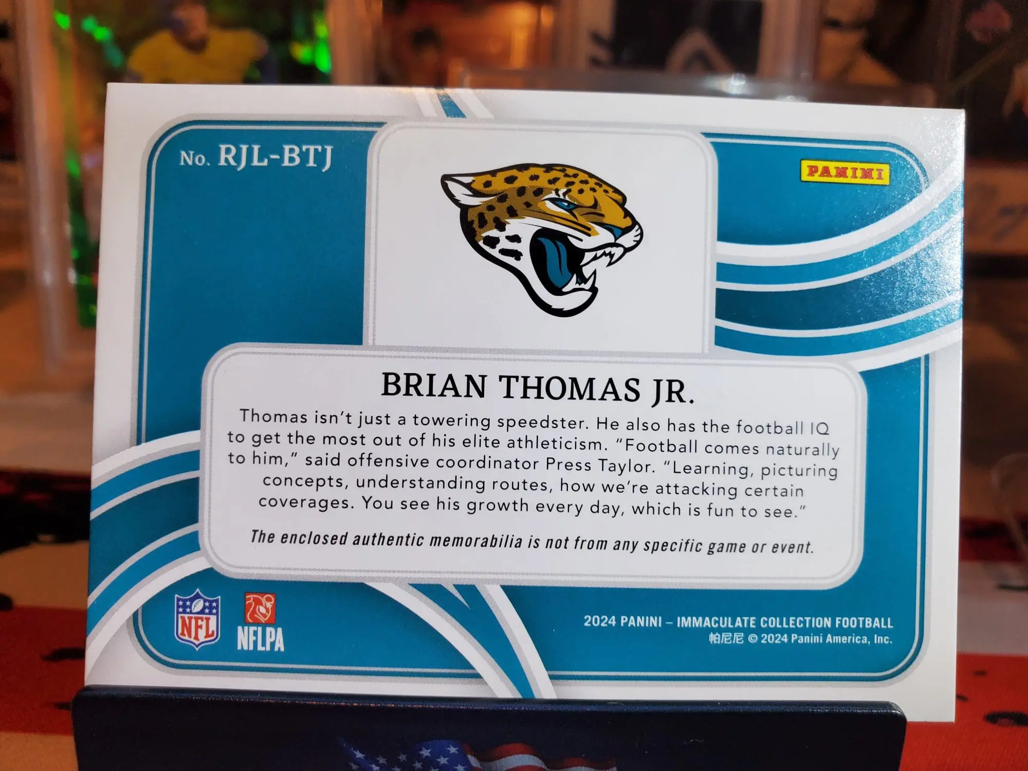 The product is a 2024 Immaculate Collection Football Gloves trading card featuring Brian Thomas Jr. of the Jacksonville Jaguars. This rookie card has a limited print run of 15 and is an original piece manufactured by Panini. The card is made of paperboard with a thickness of 100 Pt. and includes a jumbo patch parallel/variety design. It is a standard-sized sports trading card in English, making it a highly sought-after collectible for fans of the National Football League.