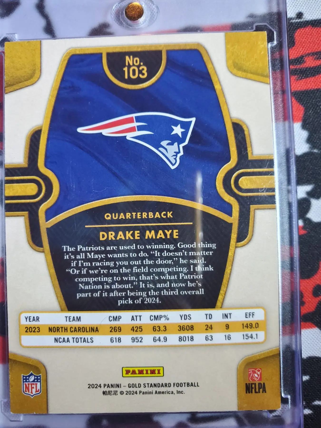 The 2024 Panini Gold Standard Rookies Drake Maye #103 Platinum /75 card is a highly collectible sports trading card featuring the rookie player from the New England Patriots, Drake Maye. This limited edition card is part of the Gold Standard set by Panini with a print run of only 75. The card is made of high-quality card stock with a 35 Pt. thickness, and it includes special features like being serial numbered, a parallel/variety, and part of the base set. This valuable piece is a must-have for fans and collectors of NFL trading cards.