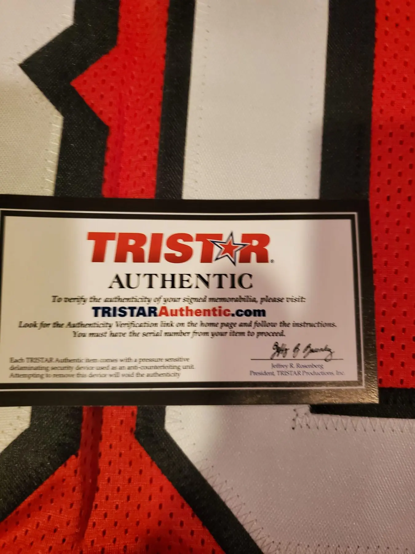The product is a Jerry Rice signed autographed San Francisco 49ers football jersey with authentication from TRISTAR Productions. This authentic sports memorabilia item is a must-have for any football fan or collector looking to own a piece of history from one of the greatest players to ever play in the NFL. The jersey represents not only the legendary player but also the iconic team, making it a valuable and cherished item for fans of the San Francisco 49ers. Custom Embroidery.