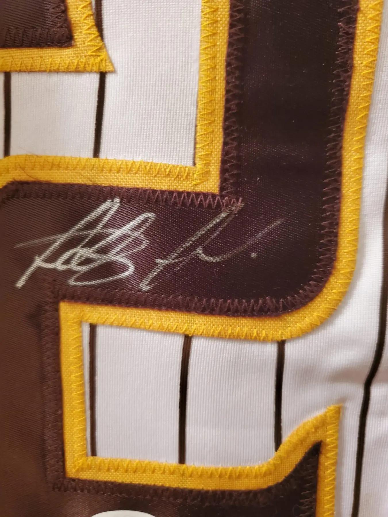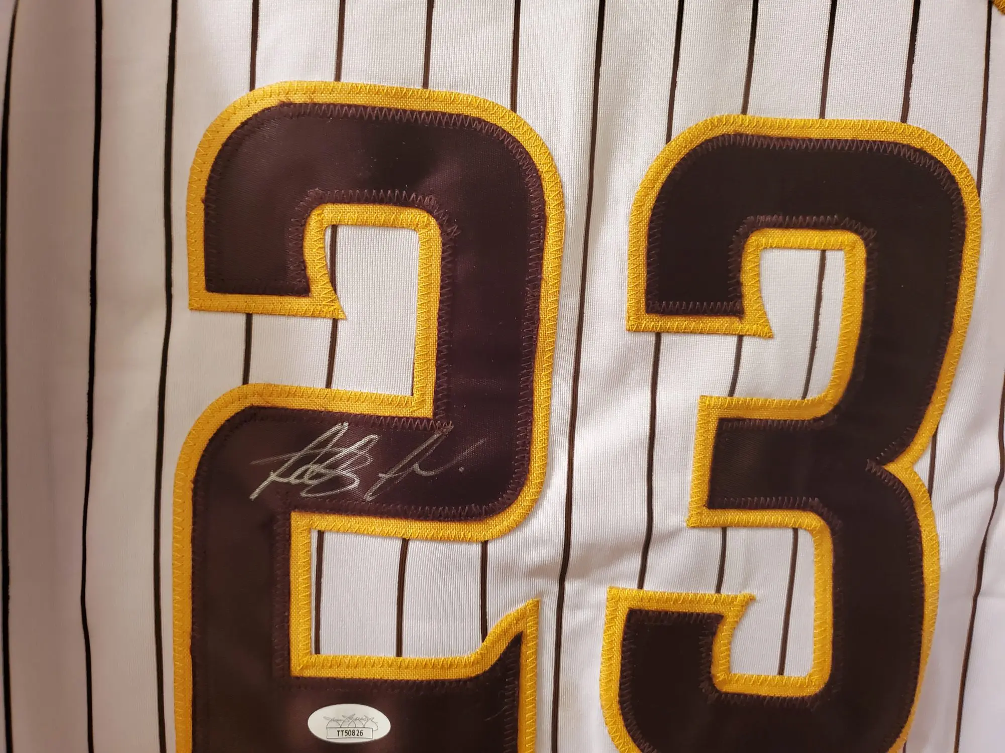 The product is an replica jersey autographed by Fernando Tatis Jr of the San Diego Padres. The autograph is authenticated by James Spence Authentication (JSA), making it a genuine and original signature. This collectible item is a must-have for any baseball fan or Tatis Jr supporter, adding a unique and valuable piece to their collection. Perfect for showing off team pride or displaying the autograph for admiration, this item encapsulates the excitement and prestige of the sport of baseball. PERFECT FOR FRAMING AND HANGING IN THE MAN CAVE!